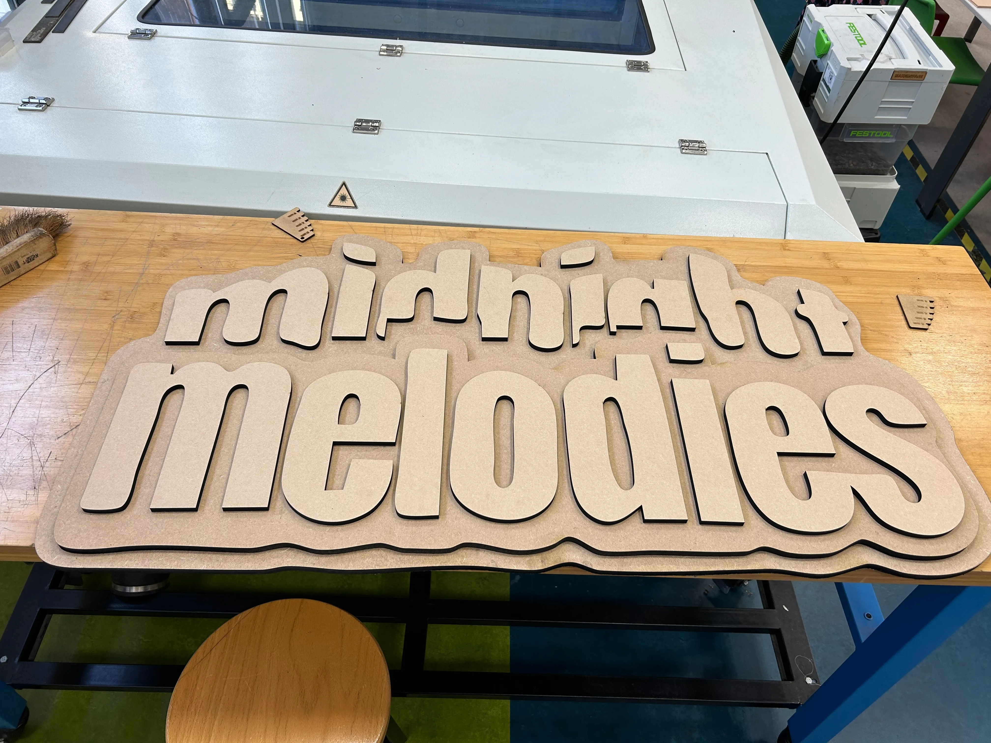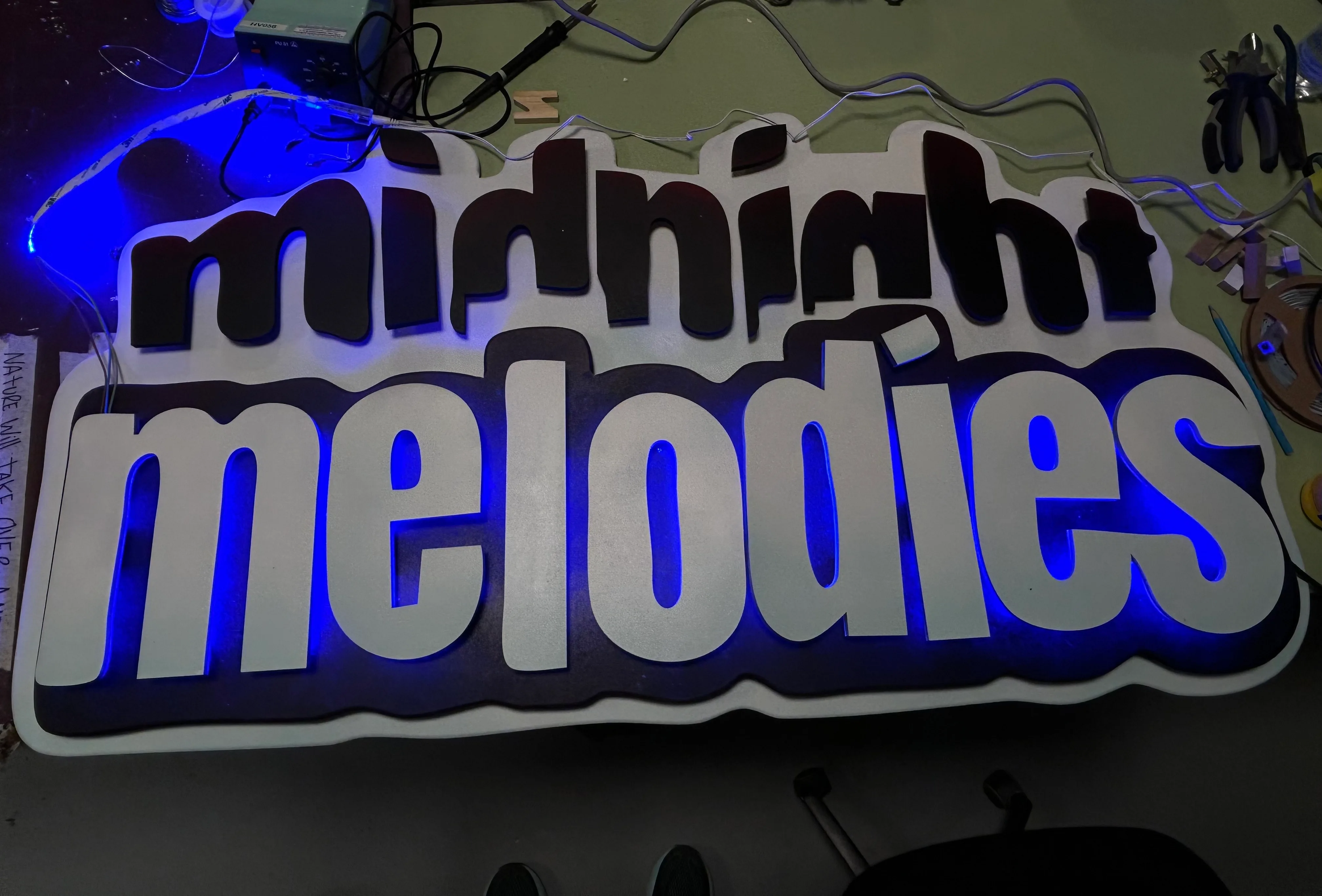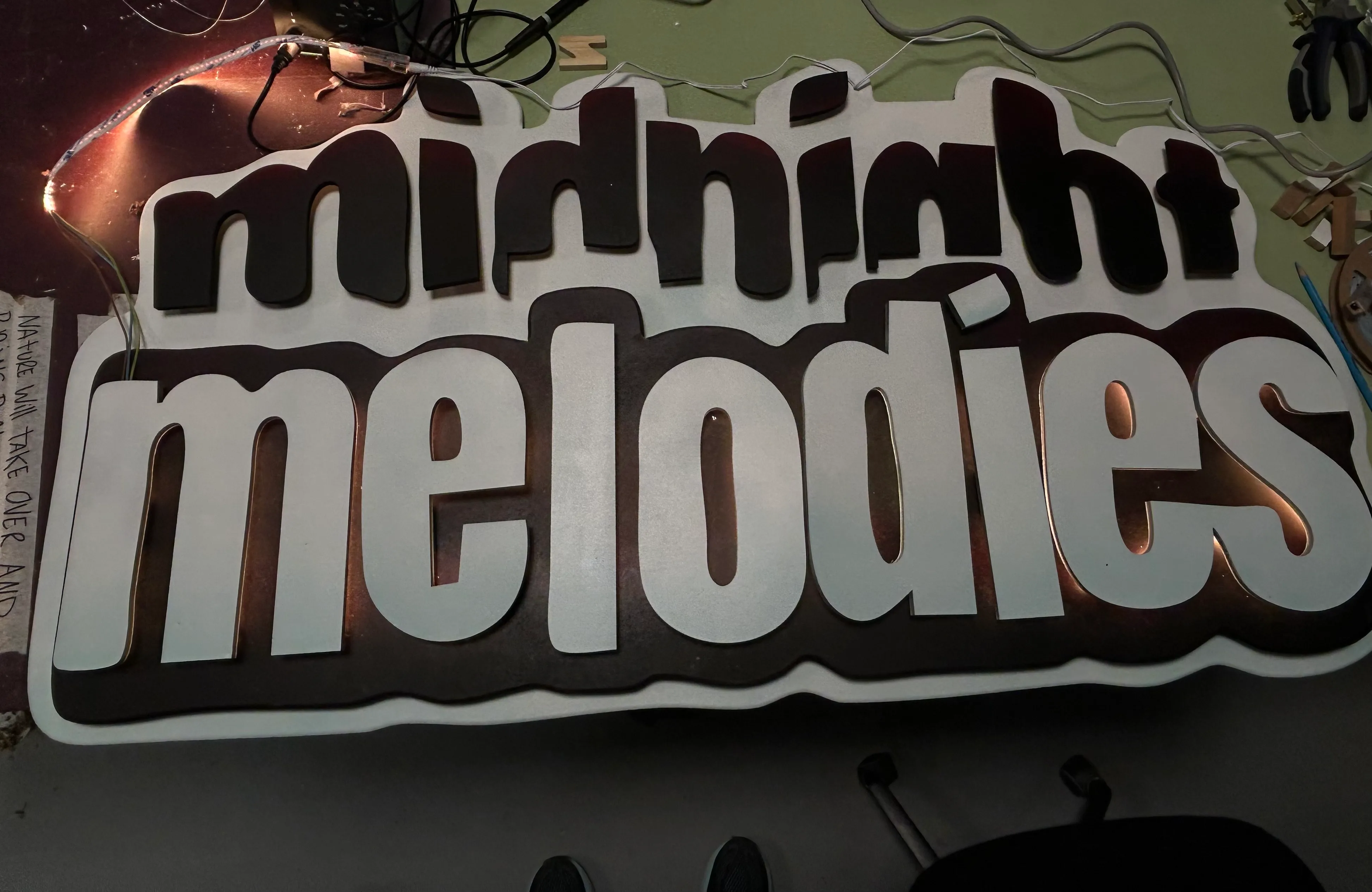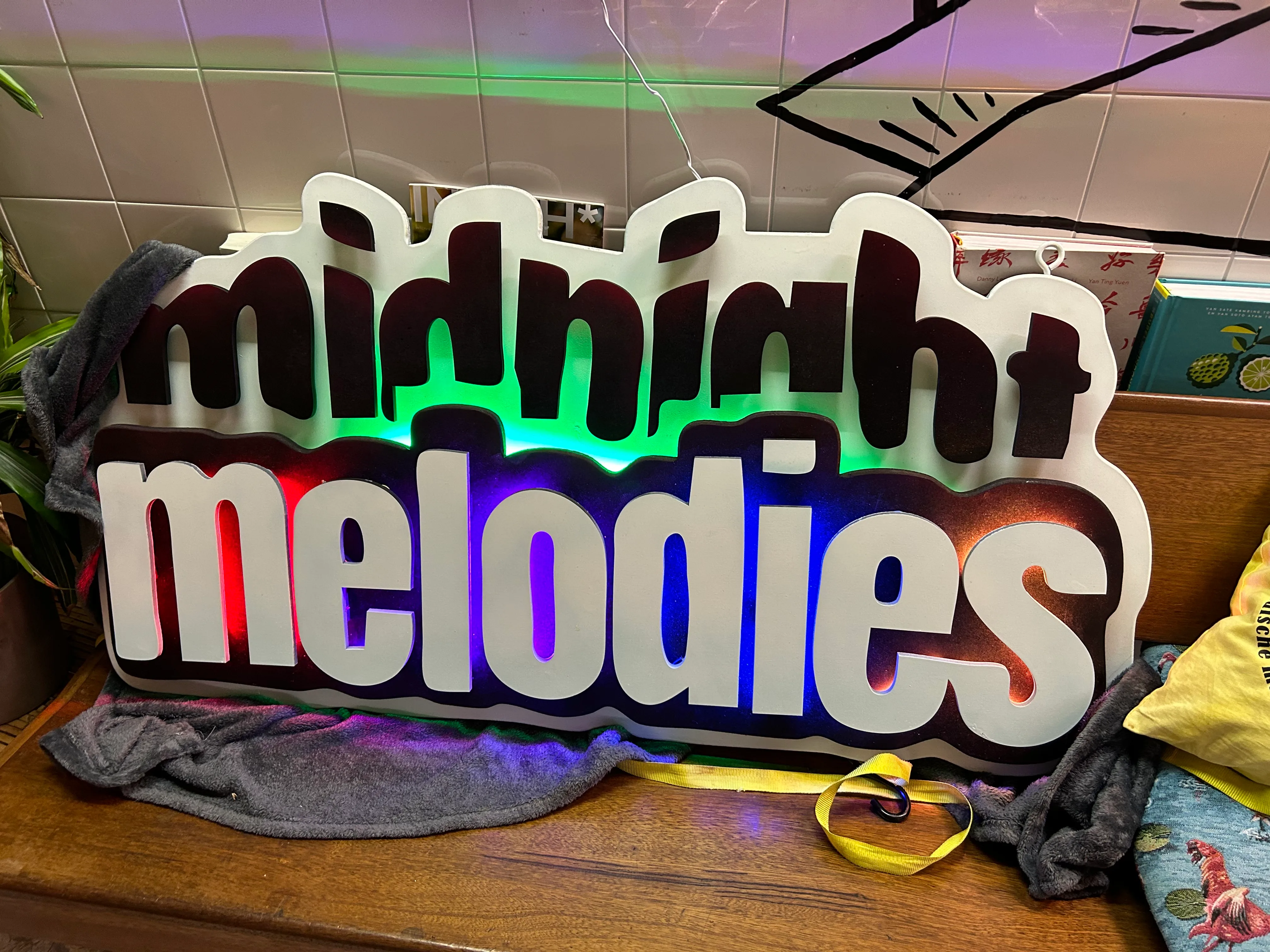 This sign I specially made for Midnight Melodies. Their logo now illuminates behind the DJ booth during their R&B events in Utrecht.
